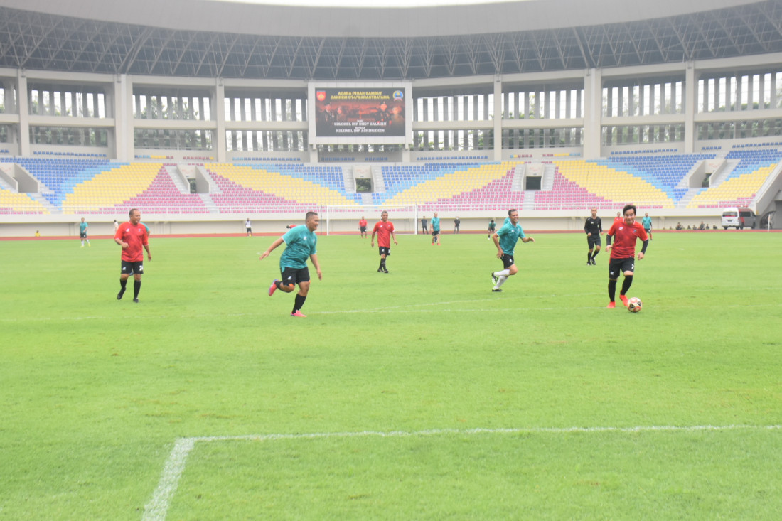 Bupati Karanganyar, Drs. H. Juliyatmono, MM bersama Walikota Surakarta, Gibran Rakabuming yang tergabung dalam satu tim, melancarkan serangan di gawang lawan dalam Laga Persahabatan Pisah Sambut Danrem 074/ Warastratama di Stadion Manahan
