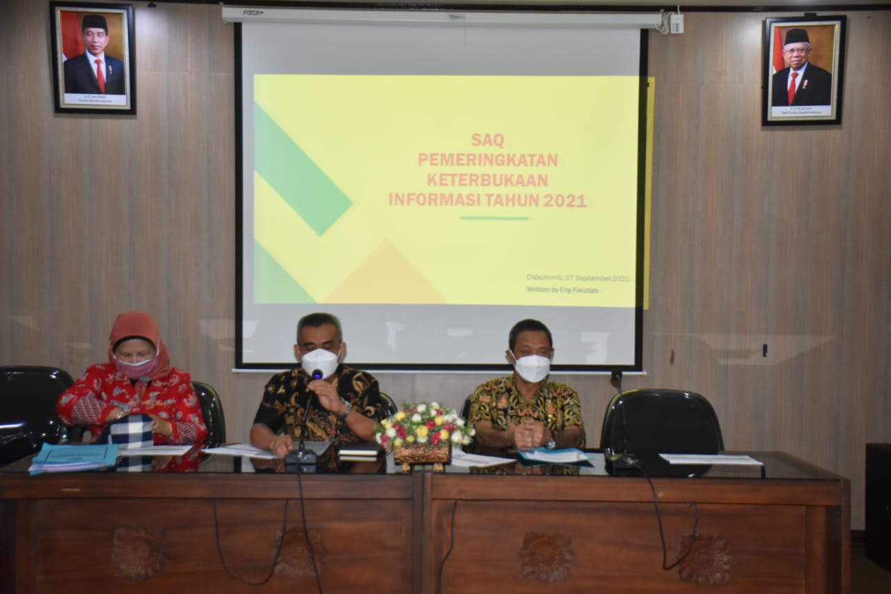 Sekretaris Daerah Kabupaten Karanganyar, Sutarno, didampingi Kepala dan Sekretaris Diskominfo Kabupaten Karanganyar memimpin rapat koordinasi pengisian SAQ 2021 di Ruang Podang 2, Kantor Bupati Karanganyar