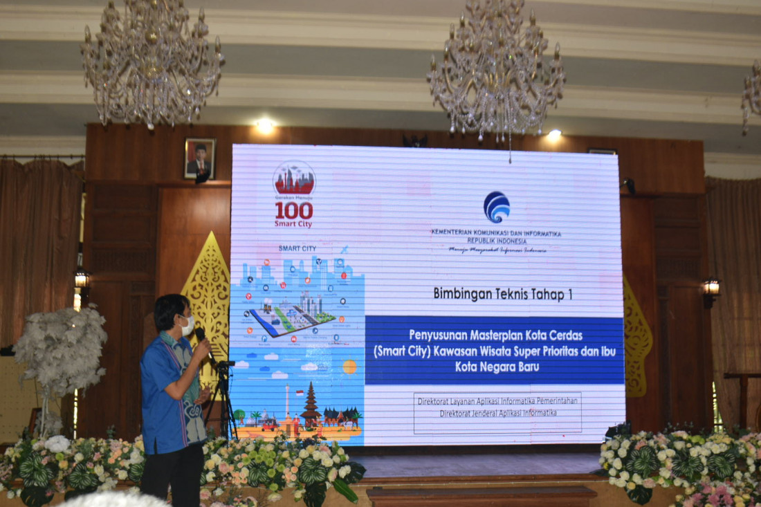 Staf ahli dari Kementerian komunikasi dan Informatika, Andrari Grahitandaru dalam Bimtek penyusunan masterplan Smart City di Hotel Jawa Dwipa, Karangpandan