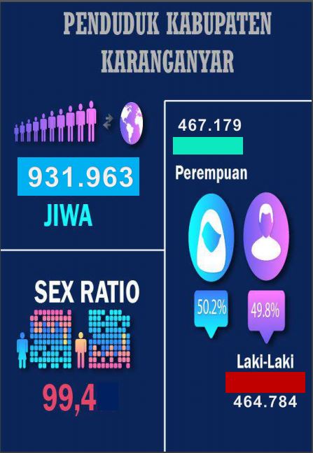 Berdasarkan data diketahui jumlah penduduk Kabupaten Karanganyar berjumlah 931.963 Jiwa. Dengan Sex Ratio 99,4, angka tersebut bermakna bahwa di setiap 100 penduduk