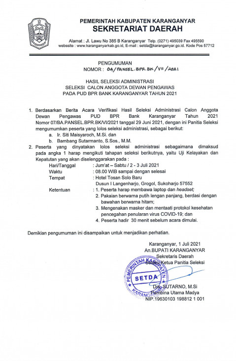 Berdasarkan Keputusan Menteri Pendayagunaan Aparatur Negara dan Reformasi Birokrasi Nomor 850 Tahun 2021 tentang Penetapan Kebutuhan Pegawai Aparatur Sipil Negara di Lingkungan Pemerintah Kabupaten Karanganyar Tahun Anggaran 2021, maka Pemerintah Kabupaten Karanganyar akan melaksanakan Seleksi Calon Aparatur Sipil Negara (CASN) Tahun Anggaran 2021, dengan ketentuan sebagai berikut :