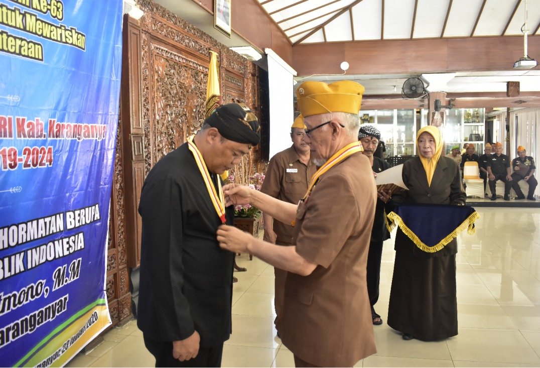 Bupati Karanganyar, Juliyatmono menyerahkan simbolis bantuan dalam rangka bakti sosial HUT Polri ke 74