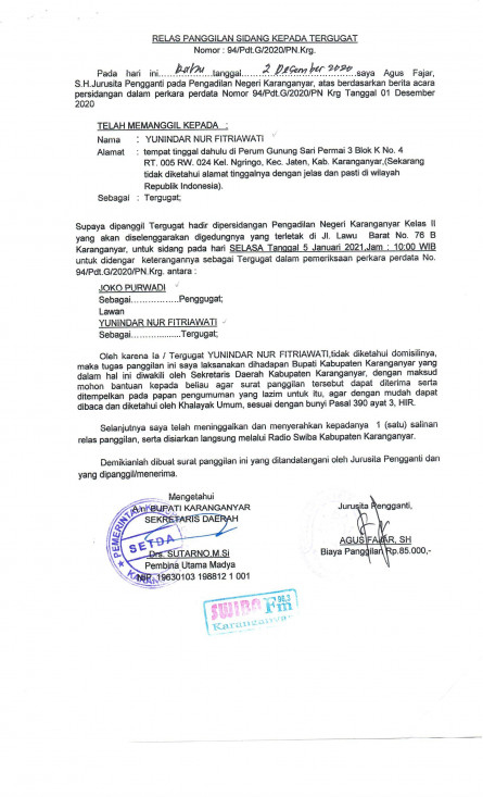 RELAAS PEMBERITAHUAN ISI PUTUSAN Nomor : 94/Pdt.G/2020/PN.Krg.