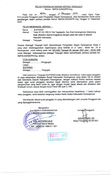 RELAAS PEMBERITAHUAN ISI PUTUSAN Nomor : 89/Pdt.G/2020/PN.Krg.
