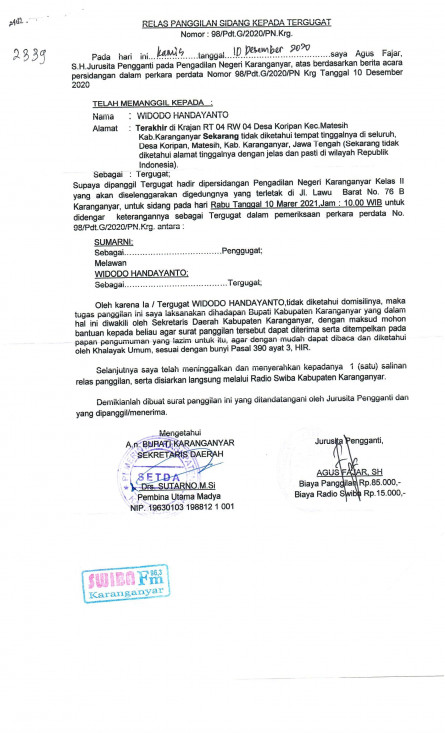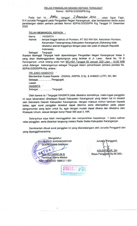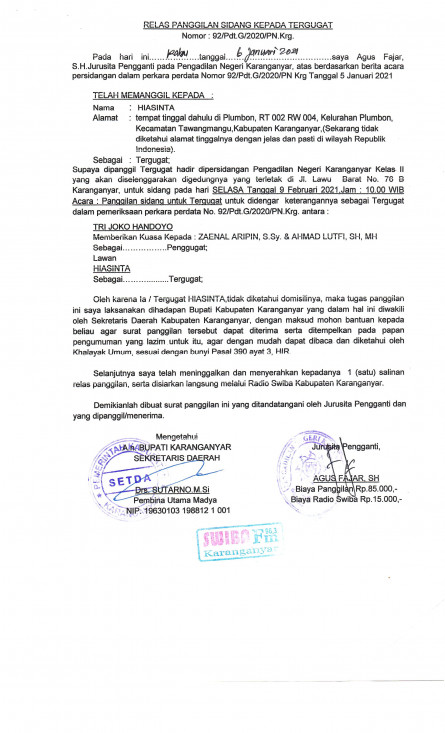 RELAAS PEMBERITAHUAN ISI PUTUSAN PENGADILAN Nomor : 22/Pdt.G/2020/PN.Krg.