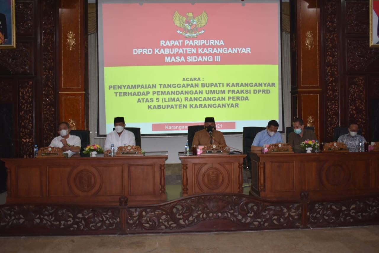DPRD Karanganyar menggelar sidang paripurna dengan agenda penyampiaan tanggapan bupati terhadap pemandangan umum fraksi aras lima rancangan Perda